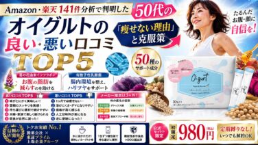 オイグルトの口コミ141件をガチ検証!「痩せない」という評判の真相は、脂肪に効くまでの期間にありました。50代のたるんだお腹・顔にアプローチする成分の秘密や、3ヶ月継続の重要性を解説。初回980円・縛りなしの「賢い投資」で自分に自信を取り戻して。