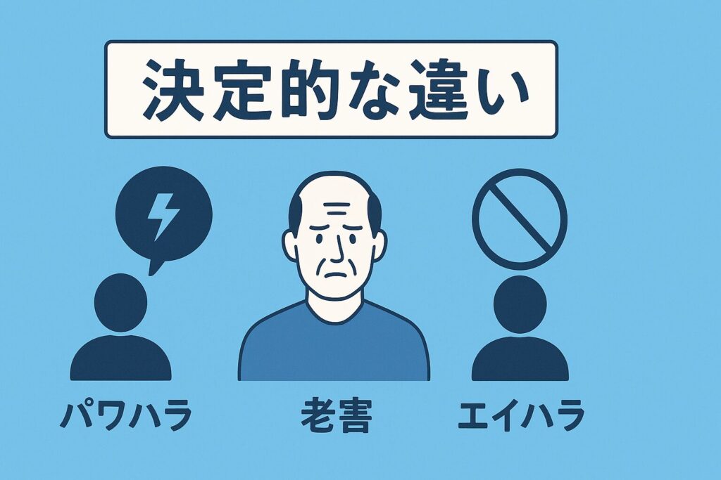 パワハラは「権力」が核ですが、エイジハラスメントは「年齢・世代」が核です。老害は「不快な言動」でしかありませんが、エイジハラスメントは「若手の成長機会や人格を否定する行為」であり、職場の秩序を乱すハラスメントなのです。