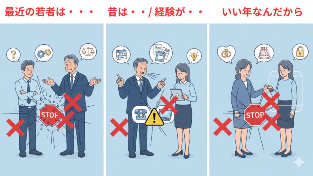 エイジハラスメントは、私のような中高年社員の無意識の言動から生まれます。ここでは、特に若手から「老害」と認定されやすい、世代間ギャップの溝を深くするNGフレーズと、その背景にあるエイジハラスメントの構造を解説します。