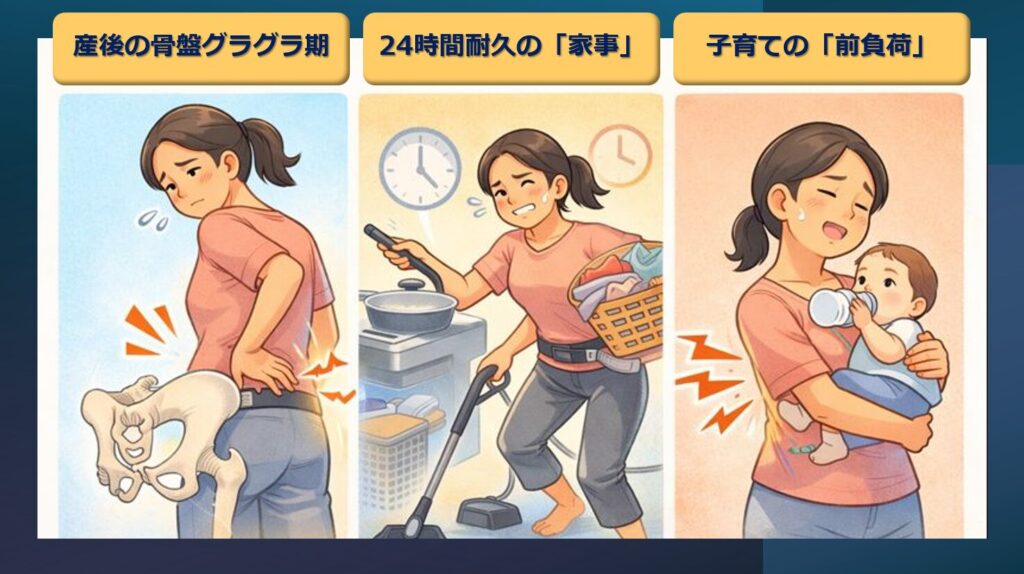 出産の影響で靭帯が緩み、土台である骨盤が安定しない状態。歩くたびに違和感があり、「面」ではなく「点(骨盤)」での固定が必要です。 - 【現象2】24時間耐久の「家事」: